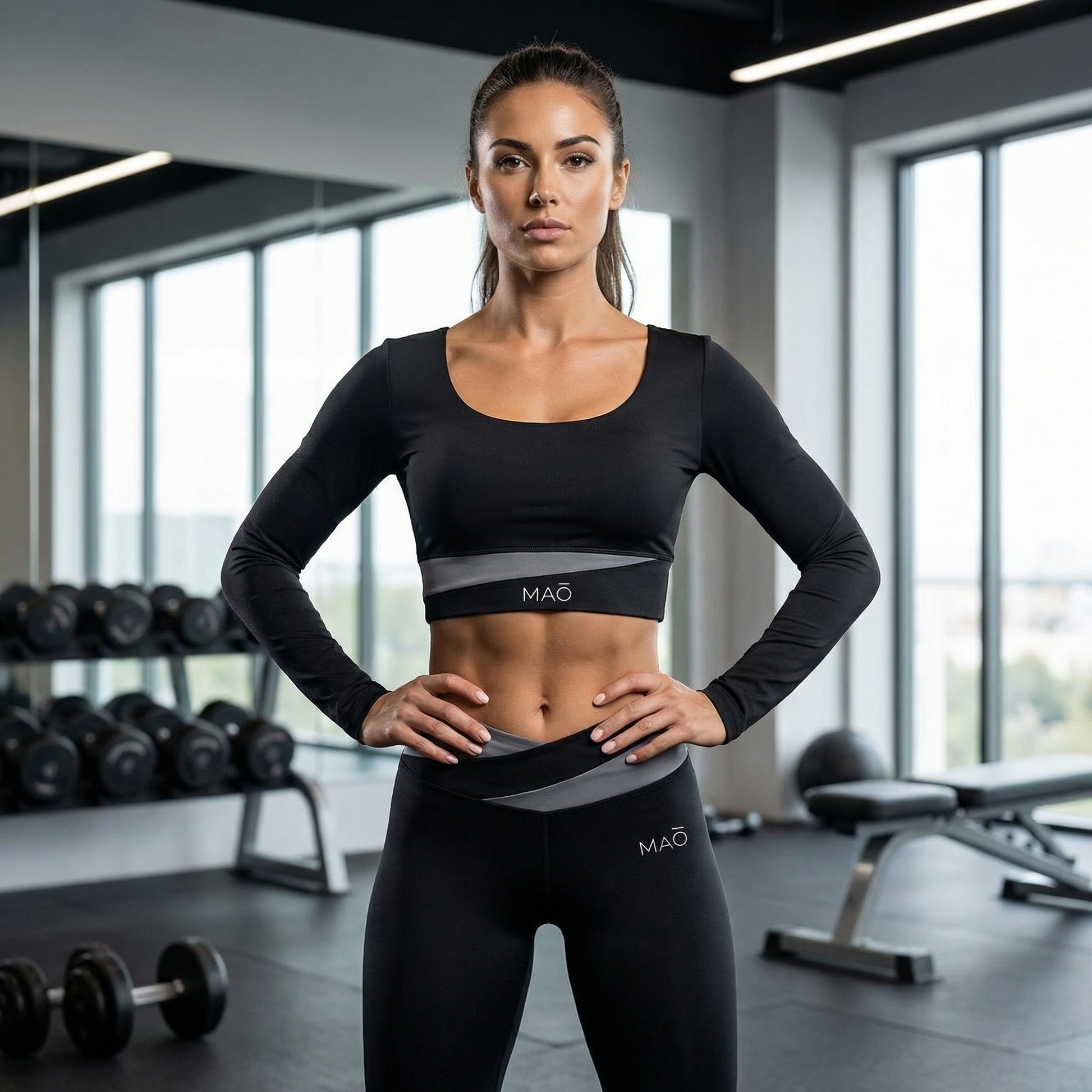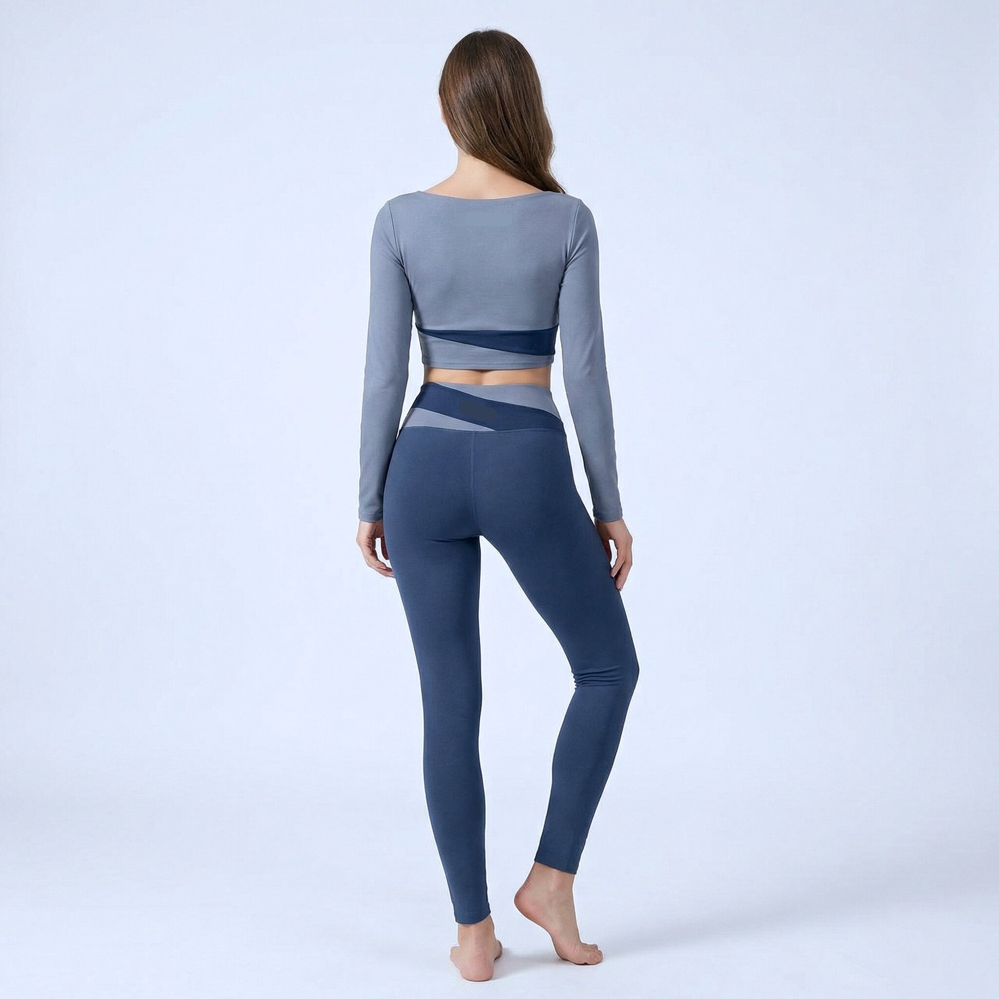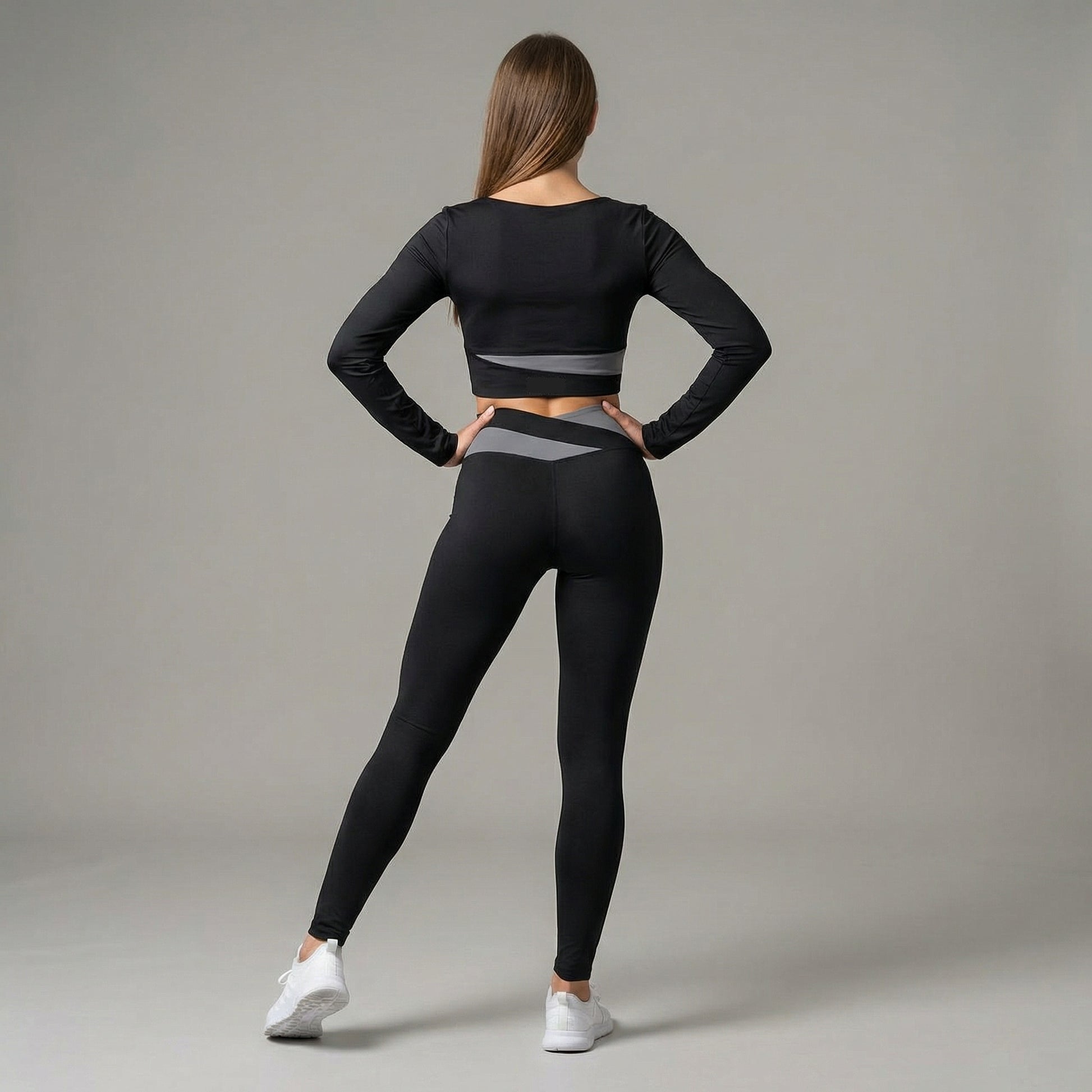 El top coordinado aporta sujeción y equilibrio visual, mientras que el legging de tiro alto con cintura cruzada en contraste redefine la zona abdominal y estiliza la figura de forma natural. El diseño envolvente de la cintura crea un efecto moldeador que realza la forma sin sacrificar comodidad.